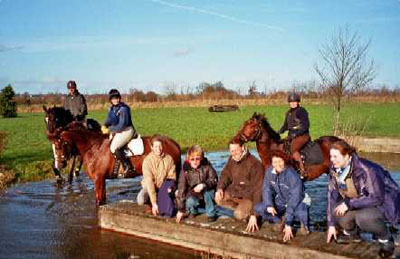 Egal ob schon routinierter Geländereiter oder Dressurreiter auf Abwegen, ob mit Youngster unter dem Sattel oder einem alten Hasen: Wir hatten alle einen Mordsspaß. Galoppieren auf der grünen Wiese, bei klarem Himmel und mit fröhlichen Pferden (man könnte es auch nach des Winters langer Hallenarbeit als übermütig bezeichnen), das ist Lebensfreude pur. Unter der fachkundigen, sehr motivierenden Anleitung haben alle Teilnehmer die verschiedensten Aufgaben bewältigt: Das Balancehalten auf der Wellenbahn, das Springen von Gräben, Wällen und Treppen und natürlich der frische Galopp durch den Teich. Am Ende waren sich alle einig - der Lehrgang sollte auch am Sonntag im Gelände fortgesetzt werden. Leider hat Petrus nicht mitgespielt. Besonders ärgerlich nach dem viel versprechenden Wetter zu Beginn des Monats. | ||||||