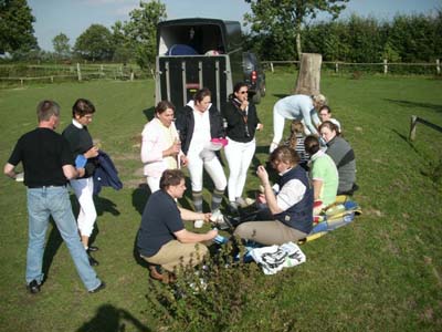 Zu diesem Familienausflug durften wir unsere alte Mitstreiterin Marlis Schwanzer wieder in großer Runde begrüßen. Nach mehrjähriger Babypause reiste sie mit Kindern und Kegel an, um auf Galan die erkrankte Janine Dassau zu ersetzen. Ein ganz neues Gesicht im Team ist Marianne Heitmann, eine weitere Leihgabe vom Reitstall Studt, die uns nach nur drei Trainingseinheiten mit Lessing hervorragend unterstützt hat. Da sie noch dazu besonders leckere Snacks mitgebracht hat, ist sie bei uns natürlich umso willkommener. |